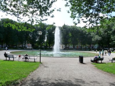 Okrągły plac zawiera centralną fontannę otoczoną kasztanowcami, brukowanymi ścieżkami i terenami zielonymi rozciągającymi się na setki metrów.