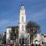 Ratusz prezentuje symetryczną architekturę z centralną ośmiokątną wieżą, białymi kolumnami i charakterystyczną iglicą wznoszącą się ku niebu.