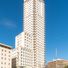 Torre de Madrid wznosi się na wysokość 142 metrów i ma 36 pięter, charakteryzując się białą fasadą i prostokątnymi wzorami geometrycznymi.