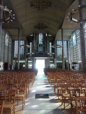 Kościół Notre-Dame charakteryzuje się cienkimi betonowymi ścianami, witrażami i centralną dzwonnicą o wysokości 50 metrów.