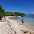 Plaża ciągnie się wzdłuż zakrzywionego wybrzeża z białym piaskiem i przejrzystą turkusową wodą, otoczona palmami i nadmorską roślinnością.