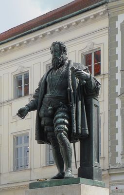 Fuggerdenkmal, Bronzefigur, durch König Ludwig I. gestiftet, von Friedrich Brugger, 1857