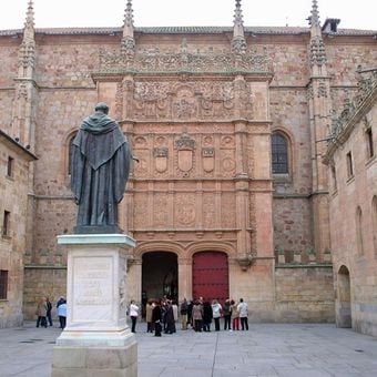 Studenci spotykają się nadal na historycznym dziedzińcu Patio de Escuelas, gdzie złota fasada z piaskowca z XVI wieku wznosi się nad głównym wejściem. Zwiedzający często szukają małej żaby wyrzeźbionej w dekoracji, która ma przynosić szczęście na egzaminach.