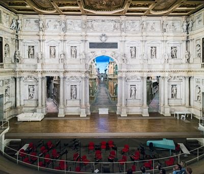 Andrea Palladio zaprojektował ten murowany teatr w 1580 roku, a Vincenzo Scamozzi ukończył budowę po śmierci Palladia w 1585 roku.