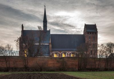 Kościół św. Stanisława i Matki Bożej Częstochowskiej prezentuje tradycyjną konstrukcję ceglaną z charakterystycznymi ostrołukami i szczegółowymi elementami kamiennymi.