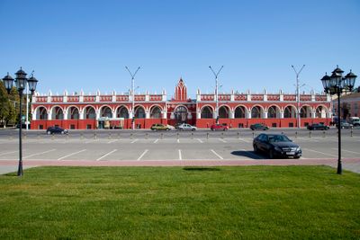 Gostiny Dvor to klasyczny kompleks handlowy w Kałudze składający się z czternastu wzajemnie połączonych budynków. Struktura zawiera czerwono-białe elementy architektoniczne zorganizowane z łukami i galeriami, które tworzą zadaszone przejścia w całym zespole.