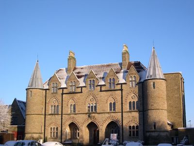 Trzypiętrowa wiktoriańska konstrukcja zawiera symetryczne elementy projektowe, duże okna i tradycyjne wojskowe detale architektoniczne na fasadzie.