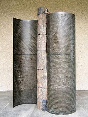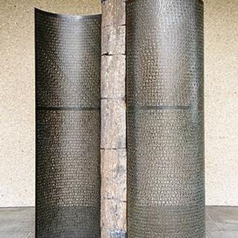 Rzeźba składa się z dwóch wygiętych paneli miedzianych z wytłoczonymi literami, zamontowanych na skamieniałym drewnie za pomocą stalowych taśm.