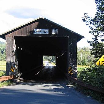 Most kryty Mount Orne rozciąga się na 267 stóp nad rzeką Connecticut, łącząc Lancaster w New Hampshire z Lunenburg w Vermont przez kratownice Howe.