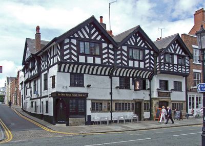 Old King's Head Hotel, Chester, Zabytkowy pub z konstrukcją szachulcową przy Lower Bridge Street, Chester, Anglia