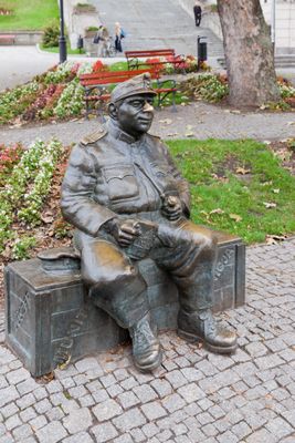 Rzeźbiarz Jacek Michał Szpak stworzył ten pomnik w 2008 roku dla upamiętnienia postaci z powieści Jaroslava Haška Przygody dobrego wojaka Szwejka.