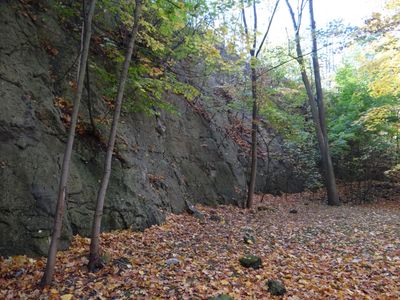 Kamieniołom wapienny rozciąga się na powierzchni 3,6 hektara w Parku Bednarskiego, ukazując ściany skalne ukształtowane przez wieki wydobycia.