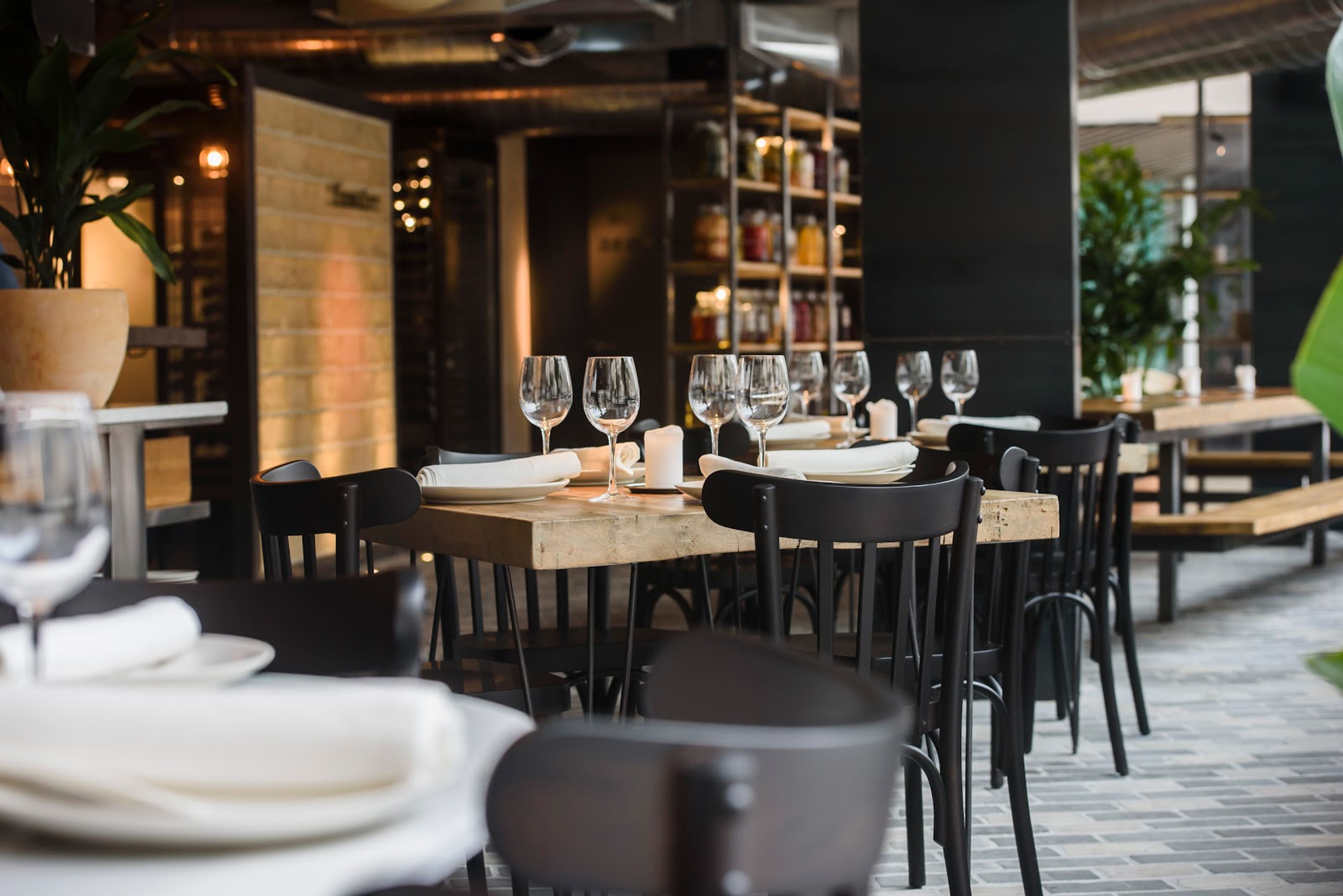 Wystrój wnętrza zawiera płytki uliczne, nagie ściany i solidne stoły robotnicze, tworząc przemysłową przestrzeń różniącą się od tradycyjnych restauracji.