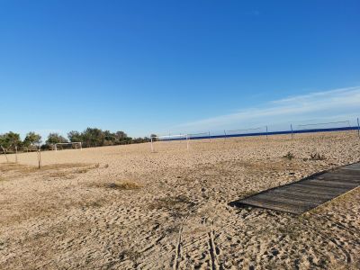 Piaszczyste wybrzeże rozciąga się na 950 metrów wzdłuż linii brzegowej, z grubym piaskiem i łagodnym spadkiem do wód Morza Śródziemnego.