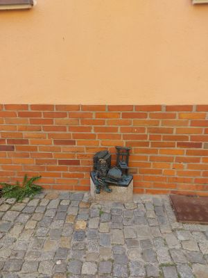 Zwiedzający mogą znaleźć tę małą brązową figurę przy współrzędnych 51.1145471 szerokości i 17.0433259 długości geograficznej na Starym Mieście.