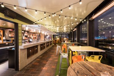 Przestrzeń na dachu zwana 'A Bar Above' oferuje opcje ekskluzywnego wynajmu na prywatne wydarzenia, pomieszczając do 90 siedzących lub 180 stojących gości przy jednoczesnym zapewnianiu panoramicznych widoków na miasto i usług rzemieślniczych koktajli.