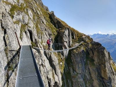Wspinacze przemierzają bezpośrednio nad lodowcem Aletsch, obiekt dziedzictwa UNESCO i największy strumień lodowy w Alpach, przechodząc przez most wiszący z trzema linami, który testuje równowagę i zapewnia niezwykłe widoki na lodowiec.