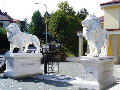 Sochy lvů u vstupu do lázeňského parku v Lázních Libverda