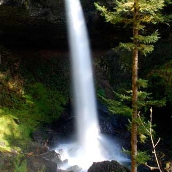 North Falls to wodospad w Silver Falls State Park, który spada po bazaltowych klifach, tworząc naturalną zasłonę spadającej wody. Woda zbiera się w basenie poniżej, stanowiąc ogniskowy punkt otaczającego leśnego krajobrazu.