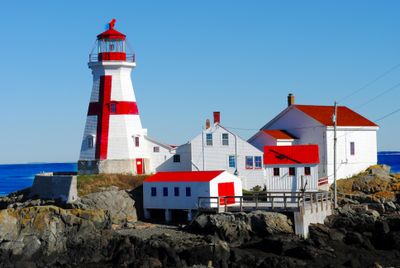 Head Harbour Light Station to ośmiokątna drewniana wieża stojąca na skalnym urwisku na wyspie Campobello. Struktura wznosi się na wysokość około 15,5 metra i wyróżnia się białymi gontem oraz wyraźnym czerwonym krzyżem na zewnętrznej ścianie.