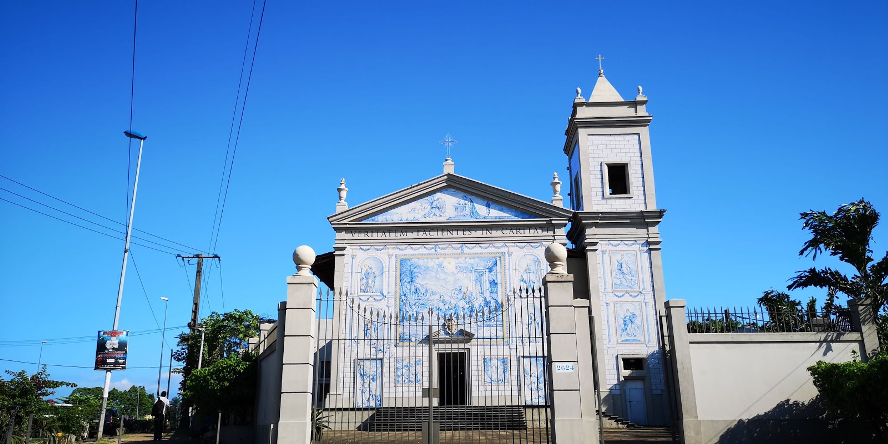 Kościół Notre-Dame-de-Lourdes posiada fasadę ozdobioną niebieskimi i białymi portugalskimi płytkami ceramicznymi.