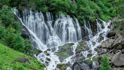 Siedem naturalnych źródeł wypływa ze ścian wapiennych na wysokości 1.450 metrów, tworząc początek systemu rzecznego Simme.