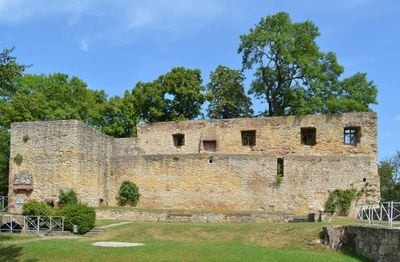 Kamienne pozostałości zamku Heldenburg znajdują się na wzgórzu, prezentując części czteroskrzydłowego budynku wokół kwadratowego dziedzińca.