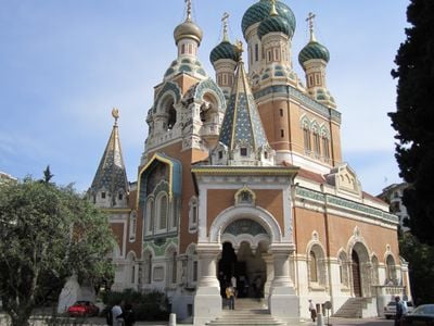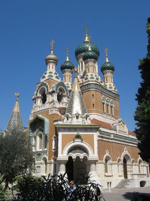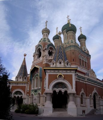Architektura rosyjskiego odrodzenia katedry, zbudowanej z cegły, kontrastuje z francuskimi śródziemnomorskimi budynkami w Nicei.