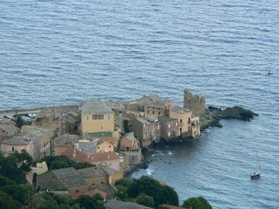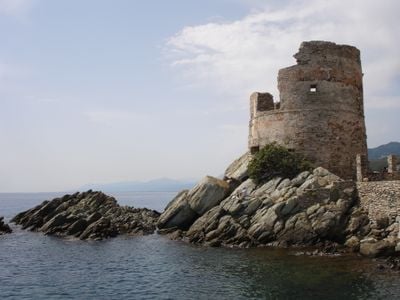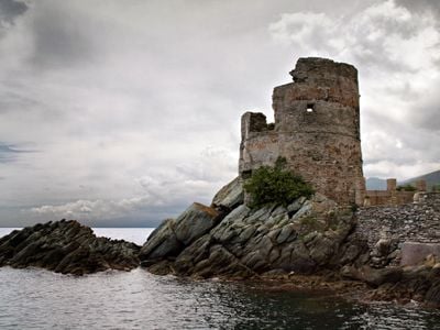 Okrągła kamienna wieża wznosi się na wschodnim wybrzeżu Cap Corse, z grubymi murami i strategicznymi otworami skierowanymi na Morze Śródziemne.