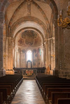 Centralna apsyda prezentuje trzy płaskie ściany zbudowane z dużych rzymskich kamieni i starożytnych marmurów odzyskanych z gallo-rzymskich fortyfikacji.