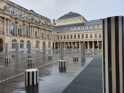 Jardin du Palais-Royal to klasyczny francuski ogród w pierwszej dzielnicy Paryża z symetrycznymi ścieżkami, przystrzyżonymi żywopłotami i fontannami otoczonymi budynkami z kolumnadami. Południowa część zawiera 260 czarno-białych w paski kolumn Dana Burina, które pełnią funkcję dzieła sztuki na otwartym powietrzu.