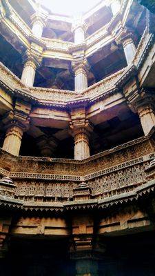 Pięciopiętrowa konstrukcja z piaskowca zawiera rzeźbione kolumny, kręte schody i wiele poziomów prowadzących do dwóch studni.