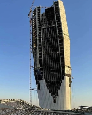Wieża Banku Centralnego Iraku wznosi się na 172 metry wzdłuż rzeki Tygrys, z charakterystycznym skręconym egzoszkieletem określającym zewnętrzną strukturę.