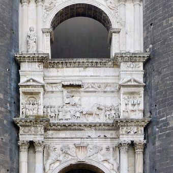 Łuk triumfalny w Castel Nuovo to marmurowa struktura z dwoma ułożonymi łukami wspierającymi kolumny korynckie. Dzieło łączy zewnętrzny plac z wewnętrznym dziedzińcem zamku i stoi pomiędzy dwiema dużymi wieżami obronnymi.