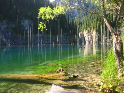 Jezioro Kajyngdy rozciąga się na 400 metrów przez wapiennym wąwozem na wysokości 2000 metrów w paśmie górskim Kungej Ałatau.
