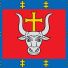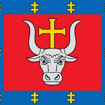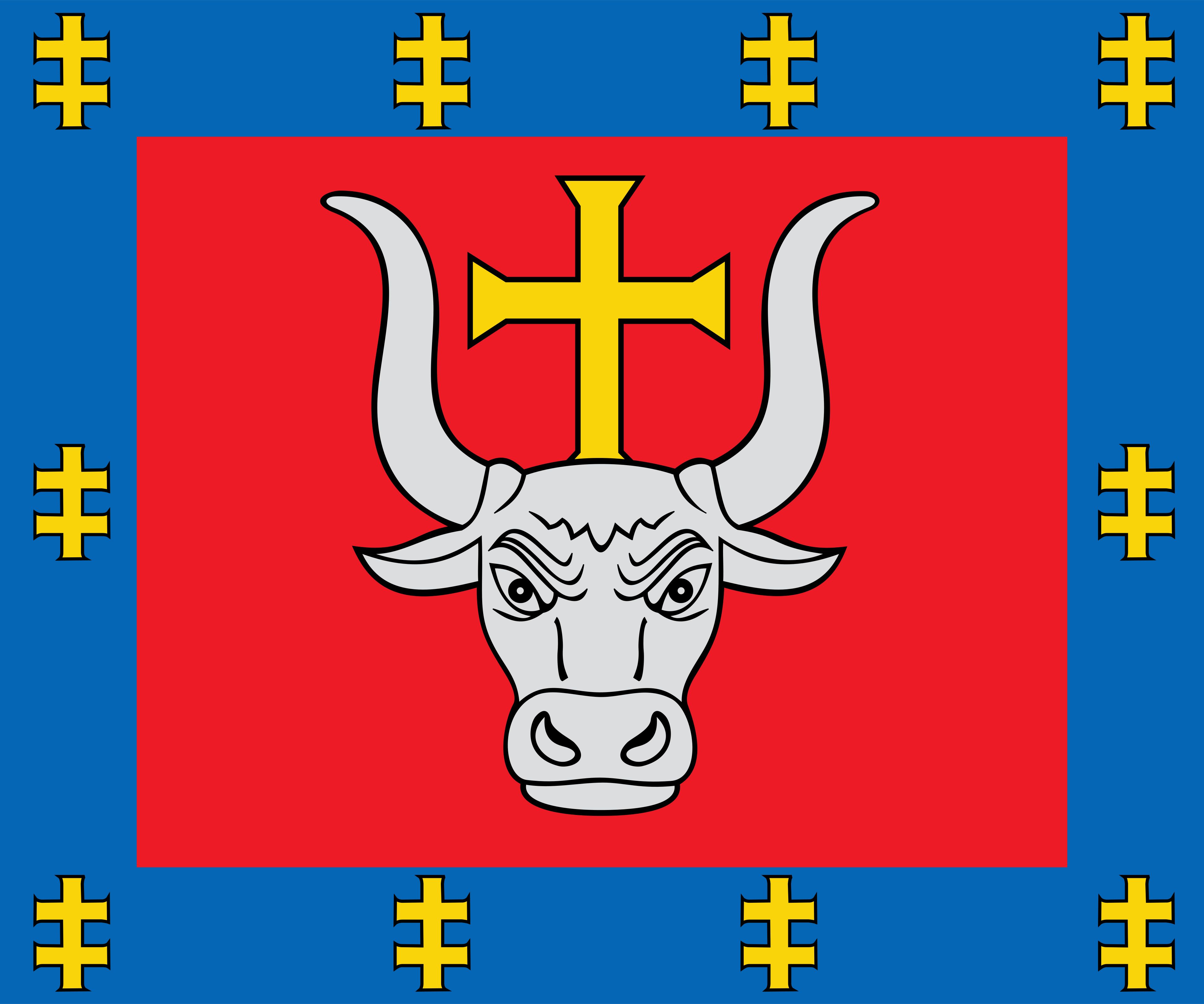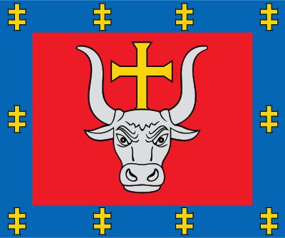 Region przedstawia elementy heraldyczne z głową tura w srebrze i złotym krzyżem na oficjalnym herbie i fladze.