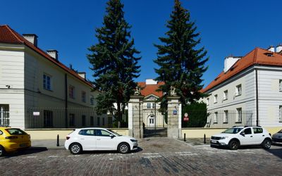 Pałac Marii Radziwiłłowej znajduje się w centrum Warszawy, prezentując architekturę neoklasyczną z monumentalnymi schodami i korynckimi kolumnami.