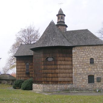 Drewniany kościół charakteryzuje się poziomą konstrukcją z bali z wydłużoną nawą i wieżą, reprezentującą architekturę kościelną południowej Małopolski.