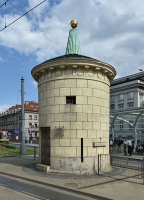 Cylindryczna konstrukcja posiada boniowane panele i schodkowy dach zwieńczony pozłacaną kulą przy skrzyżowaniu Alei Solidarności.