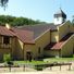 Ceglany budynek kościelny prezentuje nowoczesną architekturę łączącą tradycyjne katolickie elementy w swojej strukturalnej kompozycji.
