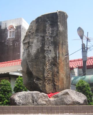 Kamienny pomnik pamiątkowy znajduje się w pobliżu wybrzeża Tainan, zawierając tradycyjne elementy architektoniczne i inskrypcje w klasycznych znakach chińskich.