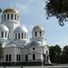 Sobór Aleksandra Newskiego przedstawia ceglaną konstrukcję z charakterystycznymi kopułami i łukami reprezentującymi architekturę neobizantyjską okresu Imperium Rosyjskiego.
