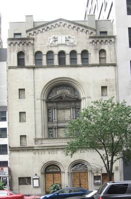 Centrum Żydowskie Congregation Beth Israel West Side posiada kolumny i symetryczne elementy architektoniczne definiujące jego trzypiętrową strukturę.