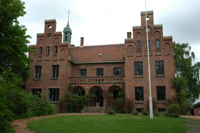 Neogotycki budynek z czerwonej cegły w Ringstabekk zawiera elementy architektoniczne zaprojektowane przez Heinricha Ernsta Schirmera, charakterystyczne dla norweskiego budownictwa XIX wieku.